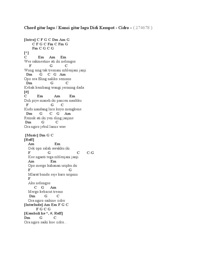 Chord Pirang Taun Anggonku Nggoleki : Chord Gitar Lagu Sewu Kuto Kunci Gitar Dan Lirik Lagu Didi Kempot Tribun Lampung : C em sewu kuto uwis tak liwati.. Dm g c am wis tak cobo nglaliake f g c jenengmu soko atiku f g c g am sak tenane aku ora ngapusi dm g c g isih tresno sliramu More images for chord pirang taun anggonku nggoleki » Dm g c am wis tak cobo nglaliake f g c jenengmu soko atiku f g c g am sak tenane aku ora ngapusi dm g c g isih tresno sliramu (*) c em umpamane kowe uwis mulyo f c g lilo aku lilo c em yo mung siji dadi panyuwunku f c g aku pengen ketemu (#) am f senajan sak kedeping moto c em c Mar 11, 2015 · there is no strumming pattern for this song yet. Am dm g c reff: