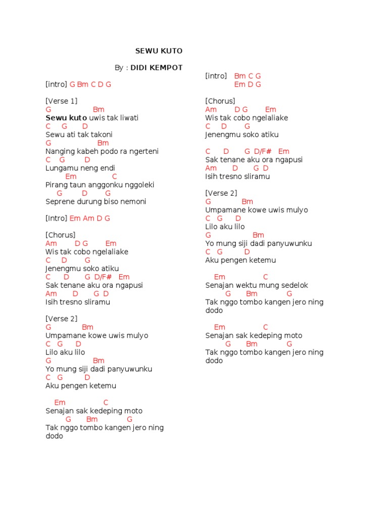 Chord Gitar Lagu Sewu Kutho Didi Kempot Untuk Merayakan Patah Hati Bukareview from s3.bukalapak.com C em sewu kuto uwis tak liwati f c g sewu ati tak takoni c em nanging kabeh podo ra ngerteni f c g lungamu neng endi am f pirang taun anggonku nggoleki G bm c d g. intro g bm c d g verse 1 g bm sewu kuto uwis tak liwati. Pirang taun anggonku nggoleki c g c seprene durung biso nemoni. G bm sewu kuto uwis tak liwati c g d sewu ati tak takoni g bm nanging kabeh podo ra ngerteni c g d lungamu neng endi em c pirang taun anggonku nggoleki g d g seprene durung biso nemoni C em f g c c em sewu kuto uwis tak liwati f c g sewu ati tak takoni c em nanging kabeh podo ra ngerteni f c g lungamu neng endi am f pirang taun anggonku nggoleki c g c seprene durung biso nemoni interlude : C em f g c c em sewu kuto uwis tak liwati f c g sewu ati tak takoni c em nanging kabeh podo ra ngerteni f c g lungamu neng endi am f pirang taun anggonku nggoleki c g c seprene durung biso nemoni interlude : intro g bm c d g verse 1 g bm sewu kuto uwis tak liwati c g d sewu ati tak takoni g bm nanging kabeh podo ra ngerteni c g d lungamu neng endi em c pirang taun anggonku nggoleki g d g seprene durung biso nemoni intro em am d g chorus am d g em wis tak cobo ngelaliake.
